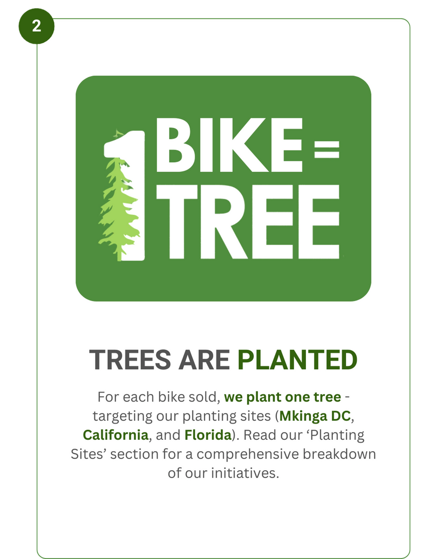 For every bike we sell, we plant one tree through our partnership with veritree. This initiative helps combat climate change, restore ecosystems, and create a more sustainable future for our planet while offsetting the environmental impact of our production processes.